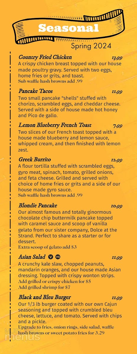Our housemade, Black angus corned brisket w/ onion, home fries, 2 eggs and toast. Served w/ your choice of toast.